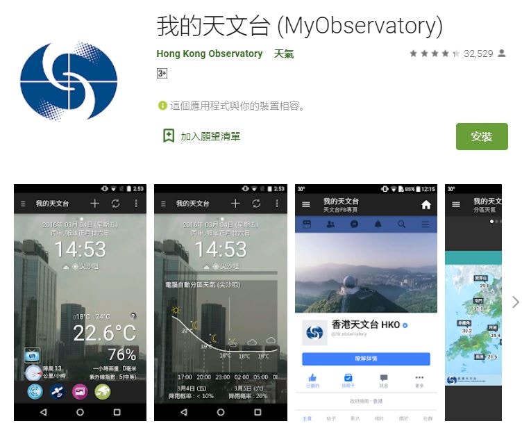 The app provides current weather including temperature, relative humidity, rainfall, wind direction and speed, as well as weather photograph collected from nearby weather stations at user's location, specified location, or selected weather stations 天文台. 登入下載 從 google play app store 官網 下載.